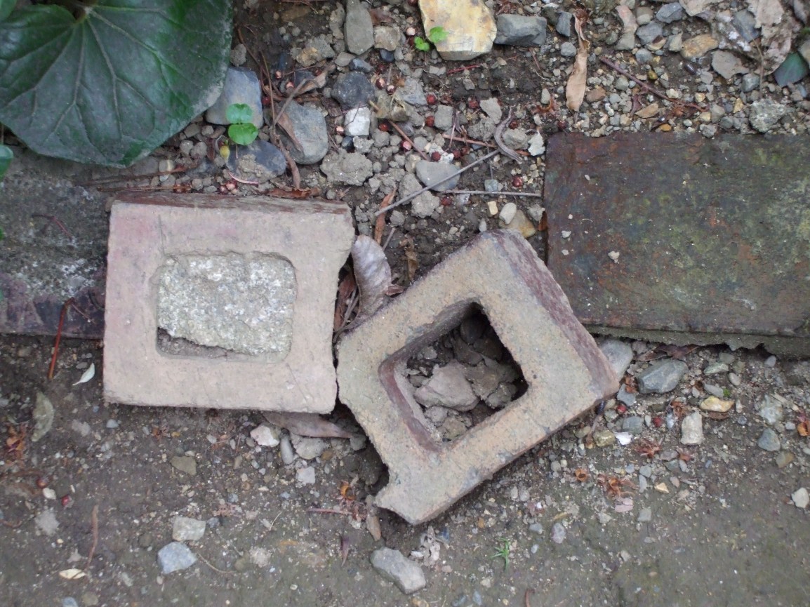 煉瓦が庭に置いてあるのですが、煉瓦の中に鉄筋を通すように穴が空いてます。
