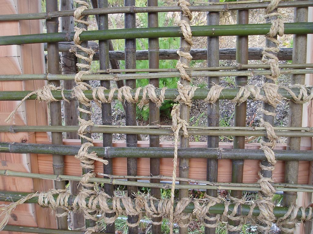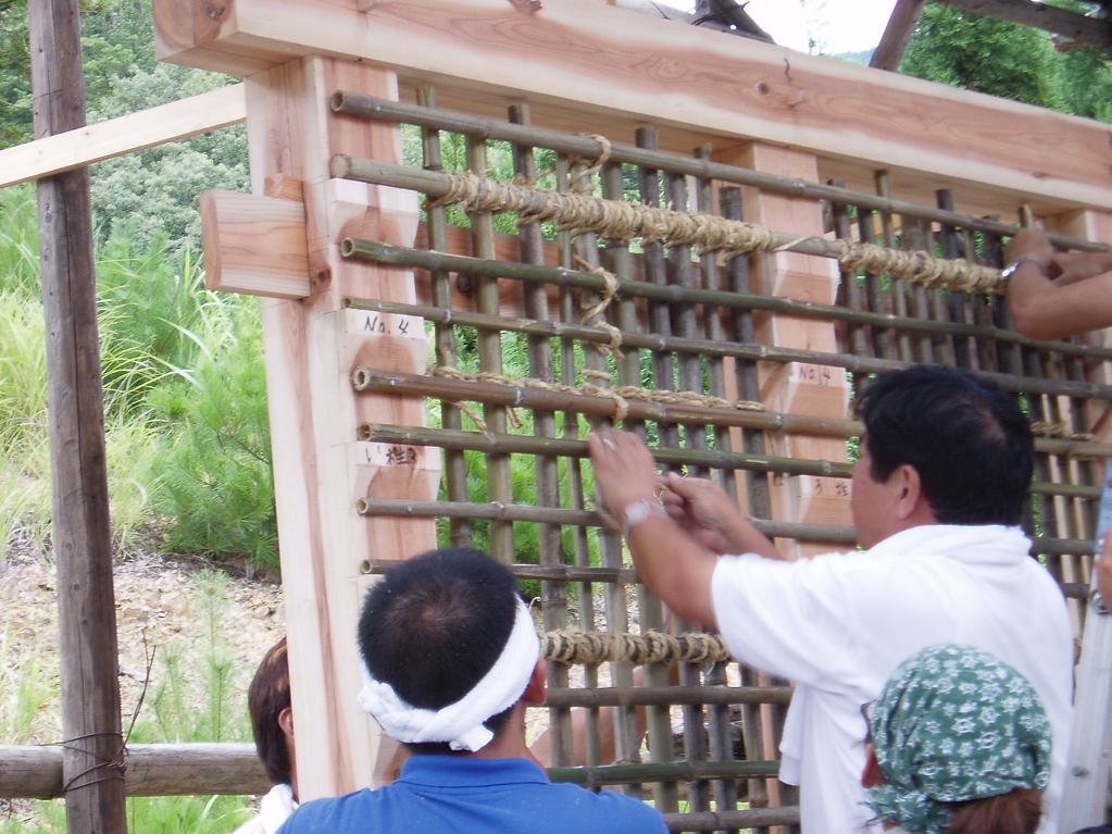 研修場ではもう作業が始まってた。みんなはもう慣れた手つきで木舞をどんどん掛けていきます。