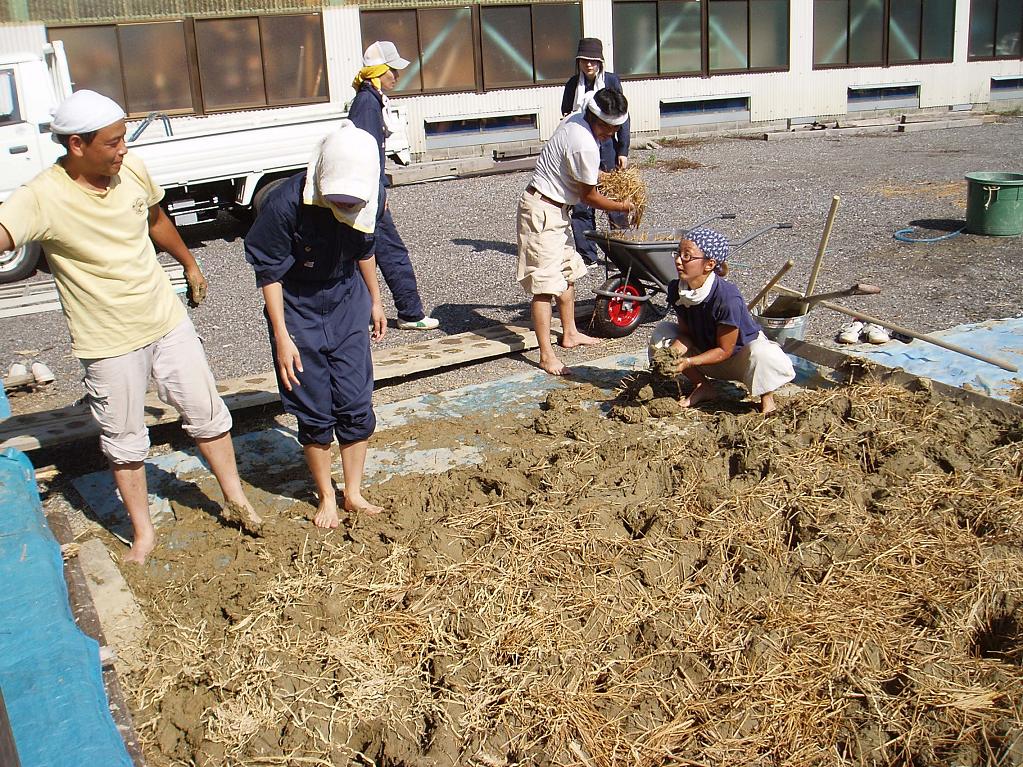 午後はみんなで土練り。シートに土とワラを一気にひろげて水で混ぜます。