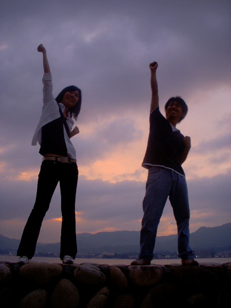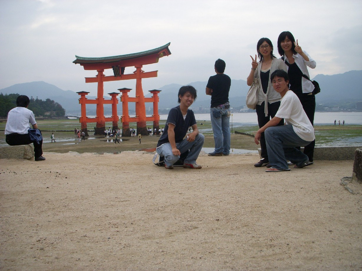 そしてついに、宮島上陸!!夕方になっていたので、とりあえず厳島神社だけ見ようと鳥居を目指してフラフラ。相変わらず鹿がたくさん。鳥居に到着したらまずは記念撮影~。見知らぬおじさんまでも仲間のようなアングルですが、違います。メンバーは5人なんですが、どの5人かわかりますか?